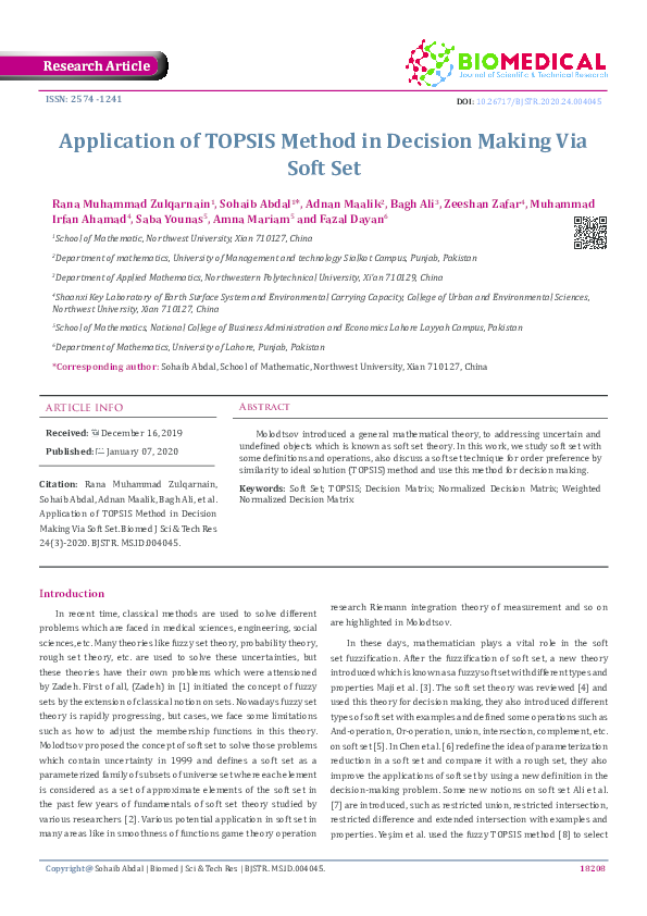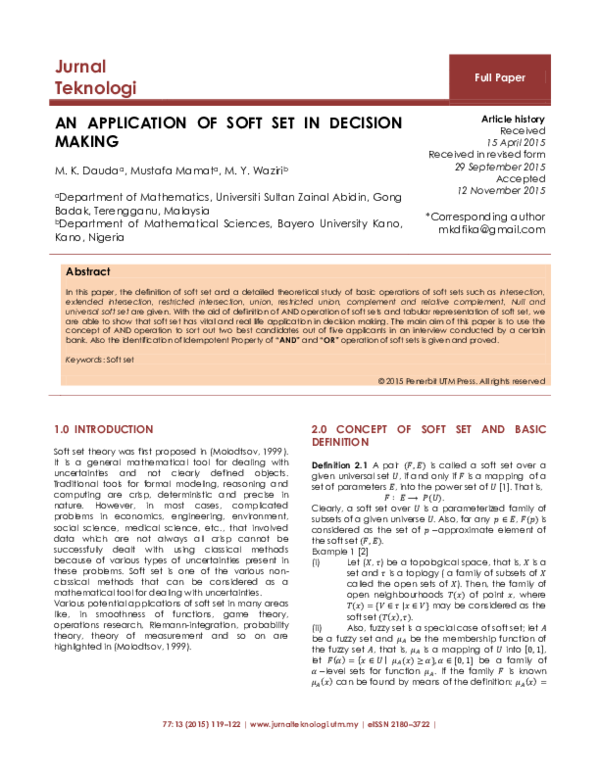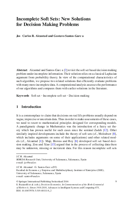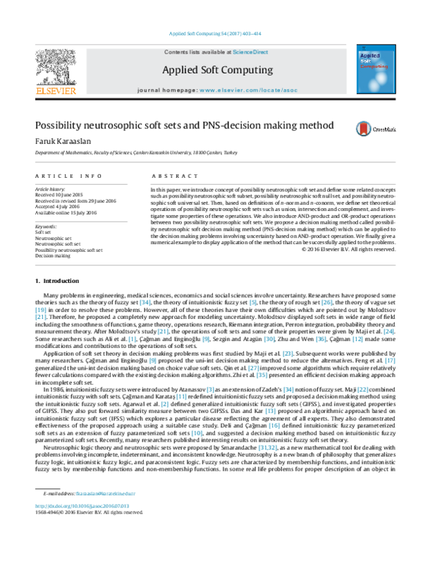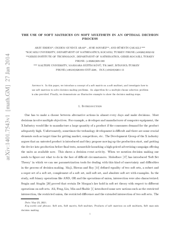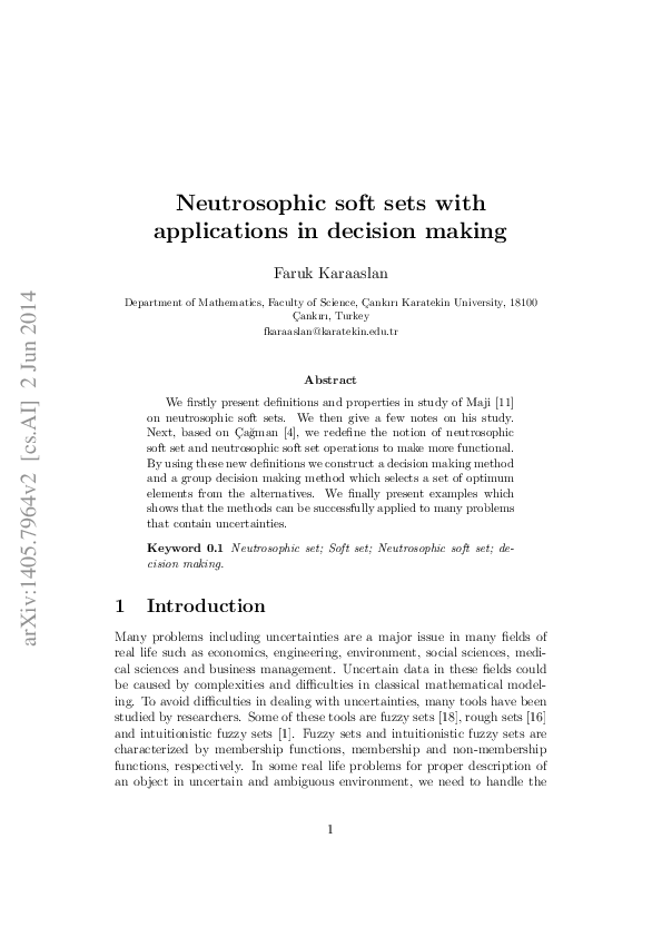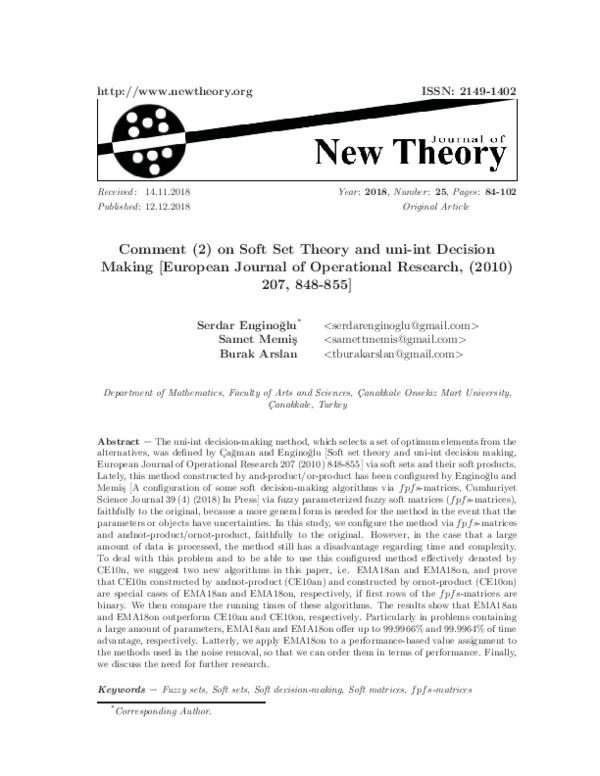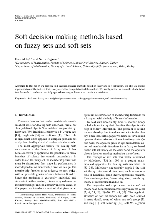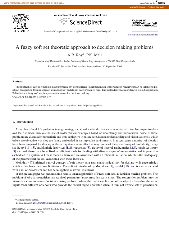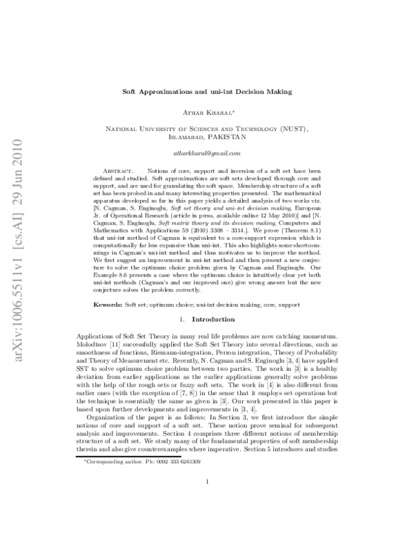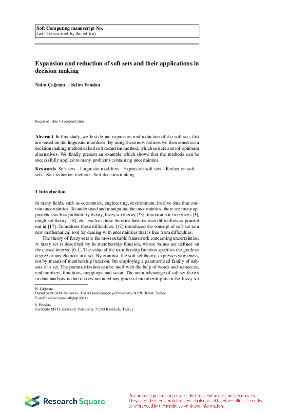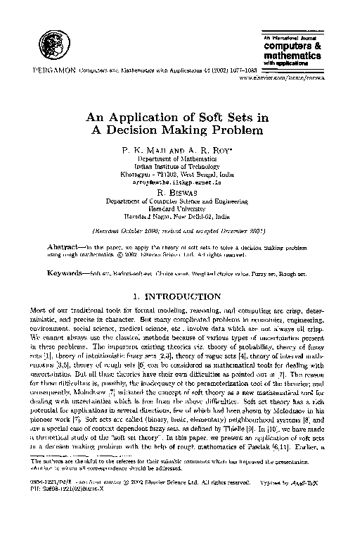 M.I. Ali, F. Feng, X. Liu, W.K. Min, M. Shabir, On some new operations in soft set theory, Computers and Mathematics with Applications 57 (2009) 1547-1553.H. Aktas ß, N. Çag ˘man, Soft sets and soft groups, Information Sciences 177 (2007) 2726-2735.K. Atanassov, Intuitionistic fuzzy sets, Fuzzy Sets and Systems 20 (1986) 87-96.N. Çag ˘man, S. Enginog ˘lu, Soft matrix theory and its decision making, Computers and Mathematics with Applications 59 (2010) 3308-3314.D. Chen, E.C.C. Tsang, D.S. Yeung, X. Wang, The parameterization reduction of soft sets and its applications, Computers and Mathematics with Applications 49 (2005) 757-763.F. Feng, Y.B. Jun, X. Zhao, Soft semirings, Computers and Mathematics with Applications 56/10 (2008) 2621-2628.W.L. Gau, D.J. Buehrer, Vague sets, IEEE Transactions on Systems, Man and Cybernetics 23/2 (1993) 610-614.M.B. Gorzalzany, A method of inference in approximate reasoning based on interval-valued fuzzy sets, Fuzzy Sets and Systems 21 (1987) 1-17.Y.B. Jun, Soft BCK/BCI-algebras, Computers and Mathematics with Applications 56 (2008) 1408-1413.Y.B. Jun, C.H. Park, Applications of soft sets in ideal theory of BCK/BCI-algebras, Information Sciences 178 (2008) 2466-2475.Z. Kong, L. Gao, L. Wang, S. Li, The normal parameter reduction of soft sets and its algorithm, Computers and Mathematics with Applications 56 (2008) 3029-3037.D.V. Kovkov, V.M. Kolbanov, D.A. Molodtsov, Soft sets theory-based optimization, Journal of Computer and Systems Sciences International 46 (6) (2007) 872-880.P.K. Maji, R. Bismas, A.R. Roy, Soft set theory, Computers and Mathematics with Applications 45 (2003) 555-562.P.K. Maji, A.R. Roy, R. Biswas, An application of soft sets in a decision making problem, Computers and Mathematics with Applications 44 (2002) 1077-1083.P. Majumdar, S.K. Samanta, Similarity measure of soft sets, New Mathematics and Natural Computation 4 (1) (2008) 1-12.D. Molodtsov, The Theory of Soft Sets, URSS Publishers, Moscow, 2004 (in Russian).D.A. Molodtsov, V. Yu. Leonov, D.V. Kovkov, Soft sets technique and its application, Nechetkie Sistemy i Myagkie Vychisleniya 1 (1) (2006) 8-39.D. Molodtsov, Soft set theory -first results, Computers and Mathematics with Applications 37 (1999) 19-31.M.M. Mushrif, S. Sengupta, A.K. Ray, Texture classification using a novel, soft-set theory based classification algorithm, Lecture Notes in Computer Science 3851 (2006) 246-254.Z. Pawlak, Rough sets, International Journal of Information and Computer Sciences 11 (1982) 341-356.C.H. Park, Y.B. Jun, M.A. Öztürk, Soft WS-algebras, Communications of Korean Mathematical Society 23/3 (2008) 313-324.D. Pei, D. Miao, From soft sets to information systems, in: X. Hu, Q. Liu, A. Skowron, T.Y. Lin, R.R. Yager, B. Zhang (Eds.), Proceedings of Granular Computing, vol. 2, IEEE, 2005, pp. 617-621.A.R. Roy, P.K. Maji, A fuzzy soft set theoretic approach to decision making problems, Journal of Computational and Applied Mathematics 203 (2007) 412-418.Q.-M. Sun, Z-L. Zhang, J. Liu, Soft sets and soft modules, in: Guoyin Wang, Tian-rui Li, Jerzy W. Grzymala-Busse, Duoqian Miao, Andrzej Skowron, Yiyu Yao (Eds.), Proceedings of Rough Sets and Knowledge Technology, RSKT-2008, Springer, 2008, pp. 403-409.Z. Xiao, K. Gong, Y. Zou, A combined forecasting approach based on fuzzy soft sets, Journal of Computational and Applied Mathematics 228 (1) (2009) 326-333.Z. Xiao, Y. Li, B. Zhong, X. Yang, Research on synthetically evaluating method for business competitive capacity based on soft set, Statistical Research (2003) 52-54.Z. Xiao, L. Chen, B. Zhong, S. Ye, Recognition for soft information based on the theory of soft sets, in: J. Chen (Ed.), Proceedings of ICSSSM-05, vol. 2, IEEE, 2005, pp. 1104- 1106.X. Yang, D. Yu, J. Yang, C. Wu, Generalization of soft set theory: From crisp to fuzzy case, in: Bing-Yuan Cao (Ed.), Fuzzy Information and Engineering: Proceedings of ICFIE-2007, Advances in Soft Computing, vol. 40, Springer, 2007, pp. 345-355.L.A. Zadeh, Fuzzy Sets, Information and Control 8 (1965) 338-353.Y. Zou, Z. Xiao, Data analysis approaches of soft sets under incomplete information, Knowledge-Based Systems 21 (2008) 941-945.