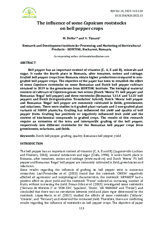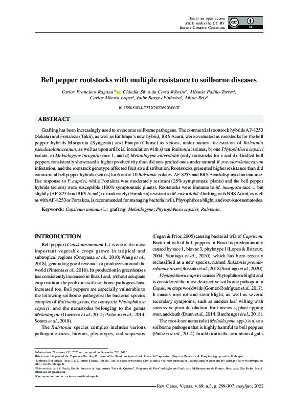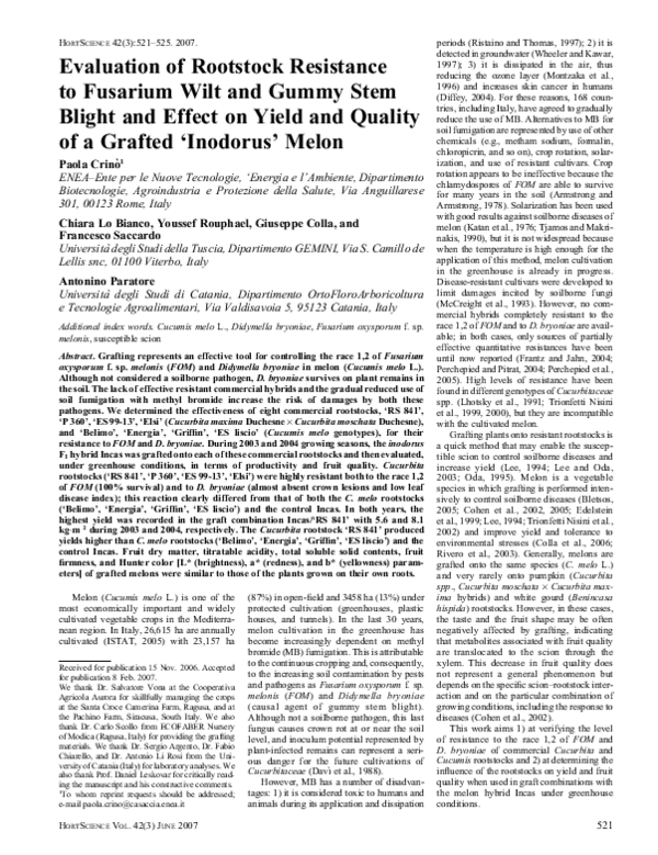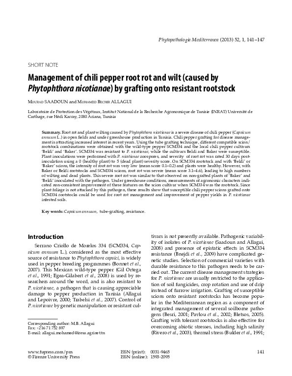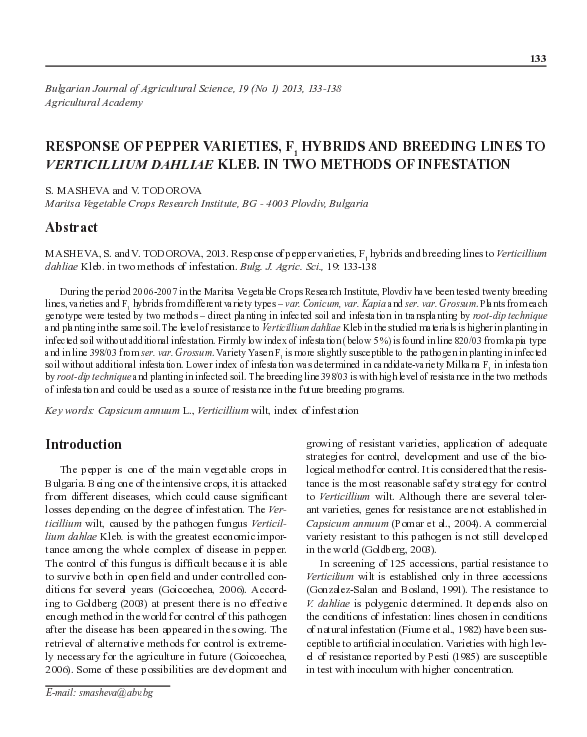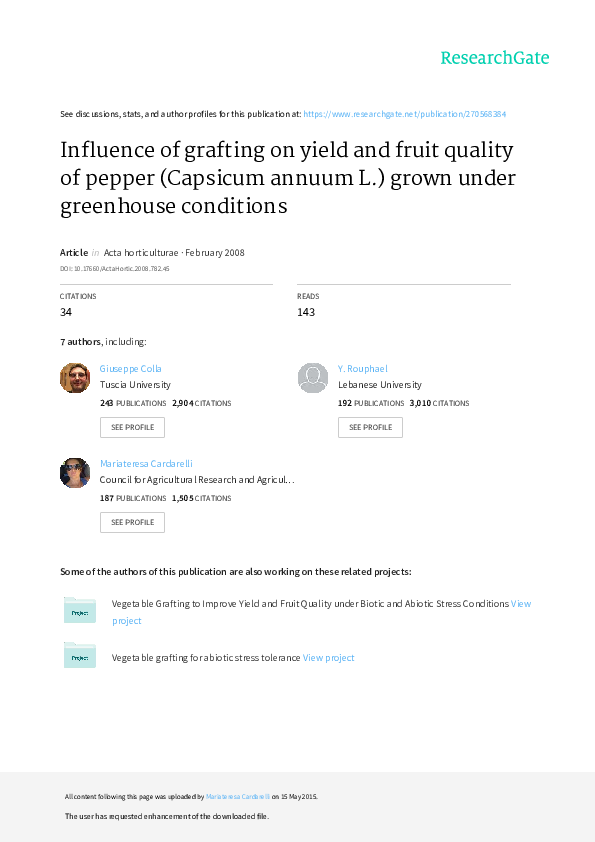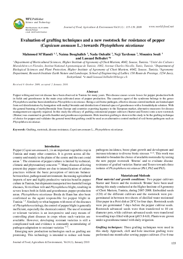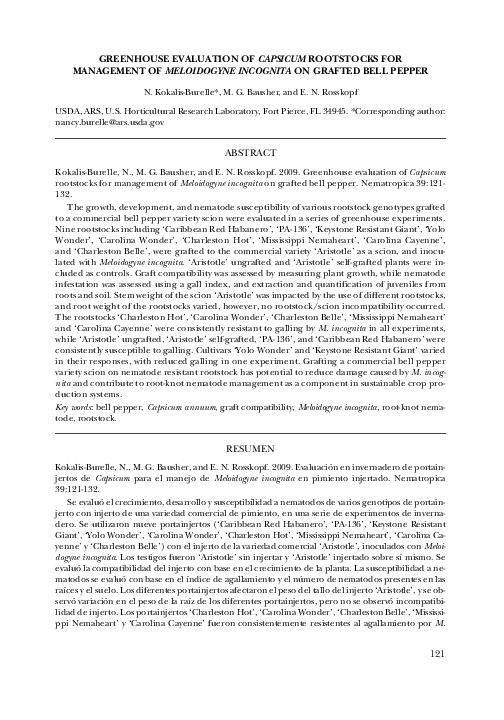 AHN, S.J., Y.J. IM, G.C. CHING, B.H. CHO and S.R. SUH 1999: Physiological responses of grafted-cucumber leaves and rootstock roots affected by low temperature. Sci. Hort. 81, 397-408.ALTINOK, H.H. 2005: First Report of Fusarium wilt of eggplant caused by Fusarium oxysporium f. sp. melongenae in Turkey. Plant Path. 54, 577p.ANONYMOUS, 2008: Pepper production in Turkey. http:// www.fao.org/corp/statistics/en.ATTIA, M.F., A.M. ARAFAT, M.A. MOUSTAFA and M.A. MOHAMED 2003: Pepper grafting, a method of controlling soilborne diseases and enhancement of fruit yield: 1. Improvement of pepper resistance to Fusarium wilt. Egypt. J. Phyto- pathol. 31, 151-165.BARKER, K.R. 1985: Nematode extractions and bioassays. In: BARKER, K.R., C.C. CARTER and J.N. SASSER (eds.): An advanced treatise on Meloidogyne, methodology, Vol. II. North Carolina State University Graphics, Raleigh, pp. 19-35.BHAT, R.G., R.F. SMITH, S.T. KOIKE, B.M. WU and K.V. SUBBARAO 2003: Characterization of Verticillium dahliae isolates and wilt epidemics of pepper. Plant Dis. 87, 789-797.BLETSOS, F., C.C. THANASSOULOPOULOS and D.G. ROUPAKIAS 2003: Effect of grafting on growth, yield and Verticillium wilt of eggplant. HortSci. 183, 186-186.BURELLE, N.K., E.N. ROSSKOPF and M.G. BAUSHER 2009: Grafting for control of Meloidogyne spp. in fruiting vegetables. Organiz. Nematologists Trop. Am. 39, 121-123.CHARU, J. and P.C. TRIVEDI 1998: Nematicidal activity of certain plants against root-knot nematode, Meloidogyne incognita infecting chickpea, Cicer arietinum. Ann. Plant Prot. Sci. 5, 171-174.COLLA, G., Y. ROUPHAEL, M. CARDARELLI, O. TEMPERINI, E. REA, A. SALERNO and F. PIERANDREI 2008: Influence of grafting on yield and fruit quality of pepper (Capsicum annuum L.) grown under greenhouse conditions. Acta Hort. 782, 359- 364.DAVIS, A.R., P.M. PERKINS VEAZIE, R. HASSELL, A. LEVI, S.R. KING and X. ZHANG 2008: Grafting effects on vegetable quality. HortSci. 43, 1670-1672.FICCADENTI, N., S. SESTILI, S. ANNIBALI, G. CAMPANELLI, A. BELISARIO, M. MACCARONI and L. CORAZZA 2002: Resistance to Fusarium oxysporium f. sp. melonis race 1, 2 in muskmelon lines Nad-1 and Nad-2. Plant Dis. 86, 897-900.HIBAR, K., M. DAAMI-REMADI, M. JABNOUN-KHIAREDDINE and M. EL MAHJOUB 2006: Control of Fusarium crown and root rot of tomato, caused by Fusarium oxysporium f. sp. radi- cis-lycopersici by grafting onto resistant rootstocks. Plant Path. J. 5, 161-165.IOANNOUS, N. 2001: Integrating soil solarization with grafting on resistant rootstocks for management of soil-borne path- ogens of eggplant. J. Hort. Sci. Biotech. 76, 396-401.JANG, Y., Y. CHO, H. RHEE and Y. UM 2008: Effects of rootstocks and night temperature on the growth and yield of grafted pepper (Capsicum annuum L.). Hort. Environ. Biotech. 49, 63-71.KHAH, E.M., E. KAKAVA, A. MAVROMATIS, D. CHACHALIS and C. GOULAS 2006: Effect of grafting on growth and yield of tomato (Lycopersicon esculentum Mill.) in greenhouse and open-field. J. Appl. Hort. 8, 3-7.KING, S.R., A.R. DAVIS, W. LIU and A. LEVI 2008: Grafting for disease resistance. HortSci. 43, 1673-1675.KINLOCH, R.A. 1990: Screening for resistance to root nema- todes. In STAR, J.L. (ed.): Methods for evaluating plant spe- cies for resistance to plant-parasitic nematodes. Hyattsville, MD, USA, Society of Nematologists, 24-32.KOIKE, S.T., K.V. SUBBARAO, R.M. DAVIS, T.R. GORDON and J.C. HUBBARD 1994: Verticillium wilt of cauliflower in California. Plant Dis. 78, 1116-1121.LEE, J.M. 1994: Cultivation of grafted vegetables I. Develop- ment of grafting robots in Japan. HortSci. 29, 235-239.LEONARDI, C. and D. ROMANO 2004: Recent issues on vegetable grafting. Acta Hort. 631, 163-174.LEONARDI, C. and F. GIUFFRIDA 2006: Variation of plant growth and macronutrient uptake in grafted tomatoes and egg- plants on three different rootstocks. Eur. J. Hort. Sci., 71, 97-101.ODA, M. 1999: Grafting of vegetables to improve greenhouse production. Food and Fertilizer Technology Center. Exten- sion Bulletin 480, 1-11.OKA, Y., R. OFFENBACH and S. PIVONIA 2004: Pepper rootstock graft compatibility and response to Meloidogyne javanica and M. incognita. J. Nematology 36, 137-141.RIVARD, C.L. and F.J. LOUWS 2008: Grafting to manage soil- borne diseases in heirloom tomato production. HortSci. 43, 2104-2111.RIVERO, R.M., J.M. RUIZ and L. ROMERO 2003: Role of grafting in horticultural plants under stress conditions. J. Food Agric. Environment. 1, 70-74.ROS, C., M.M. GUERRERO, M.A. MARTINEZ, N. BARCELO, M.C. MARTINEZ, I. RODRIGUEZ, A. LACASA, P. GUIRAO and A. BELLO 2005: Resistant sweet pepper rootstocks integrated into the management of soilborne pathogens in greenhouse. Acta Hort. 698, 305-310.SOGUT, M. and I.H. ELEKCIOGLU 2007: Methyl bromide alter- natives for controlling Meloidogyne incognita in pepper varieties in the Eastern Mediterranean region of Turkey. Turk. J. Agric. For., 31, 31-40.TRAKA-MAVRONA, E., M. KOUTSIKA-SOTIRIOU and T. PRITSA 2000: Response of squash (Cucurbita spp.) as rootstock for melon (Cucumis melo L.). Sci. Hort. 83, 353-362.